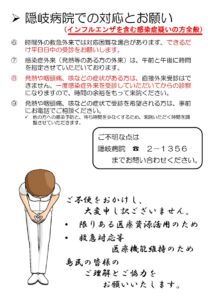 季節性インフルエンザ流行に伴うご協力のお願いについて 掲載日:2024年12月24日 現在、季節性インフルエンザ陽性者が隠岐の島町でも増加しています。 今一度、基本的な感染防止対策の徹底と、家庭や職場等での健康管理の徹底をいただき、感染者の抑制にご協力いただきますようお願いいたします。 インフルエンザかな?と思ったら Tweet
